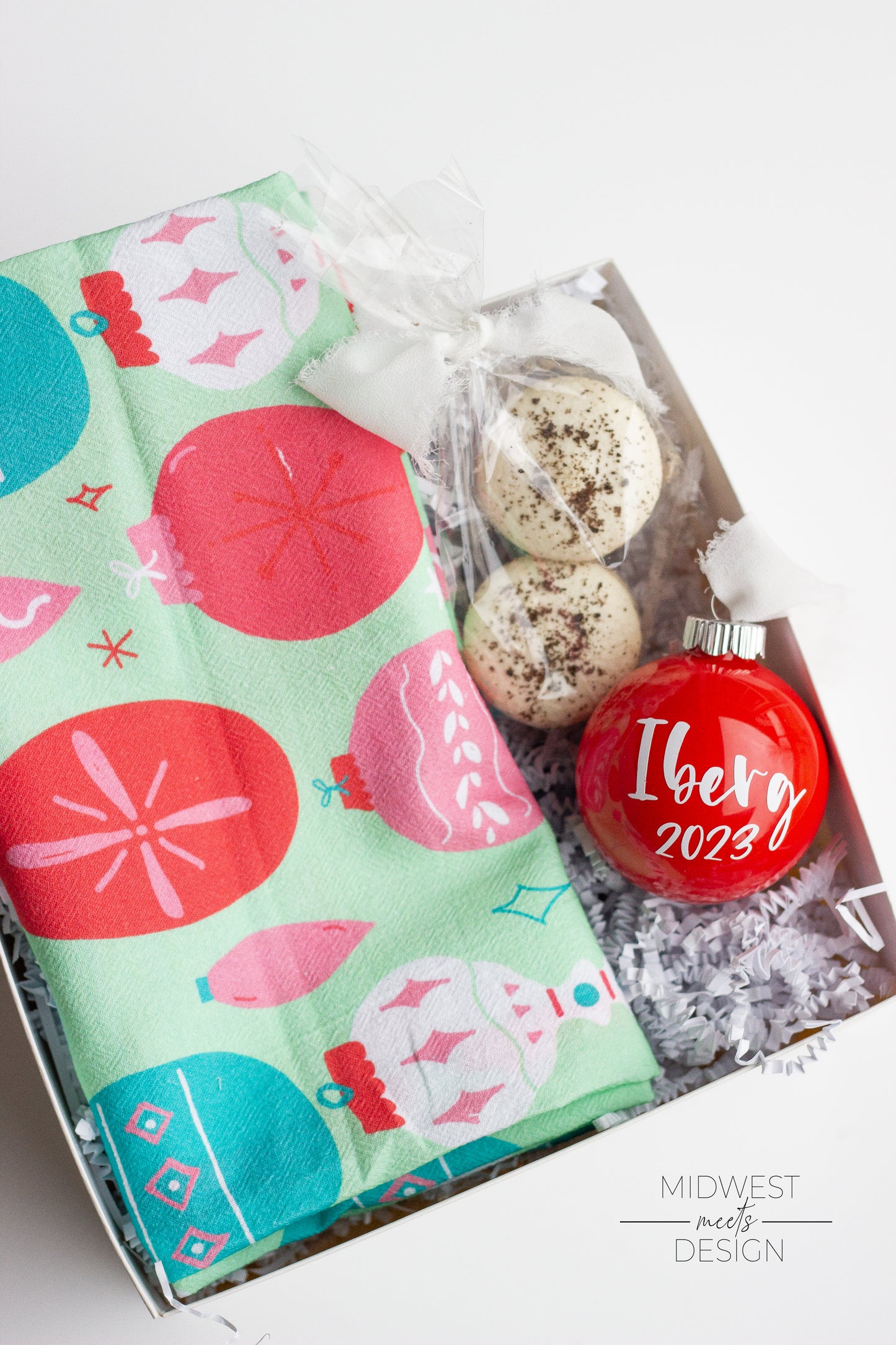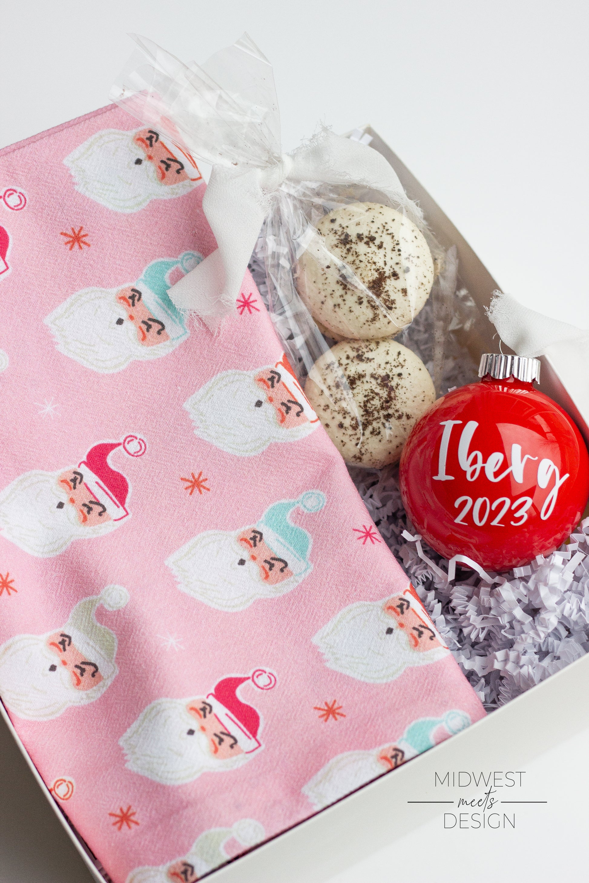 This customized holiday box is perfect for a friend, teacher, co-worker, or family! This box is currently only offered to locals and will be a porch pickup. Features all the customized goodies in an 8"x10" white box sealed with your ribbon of choice and a sprig of winter greenery. Here's how it works!